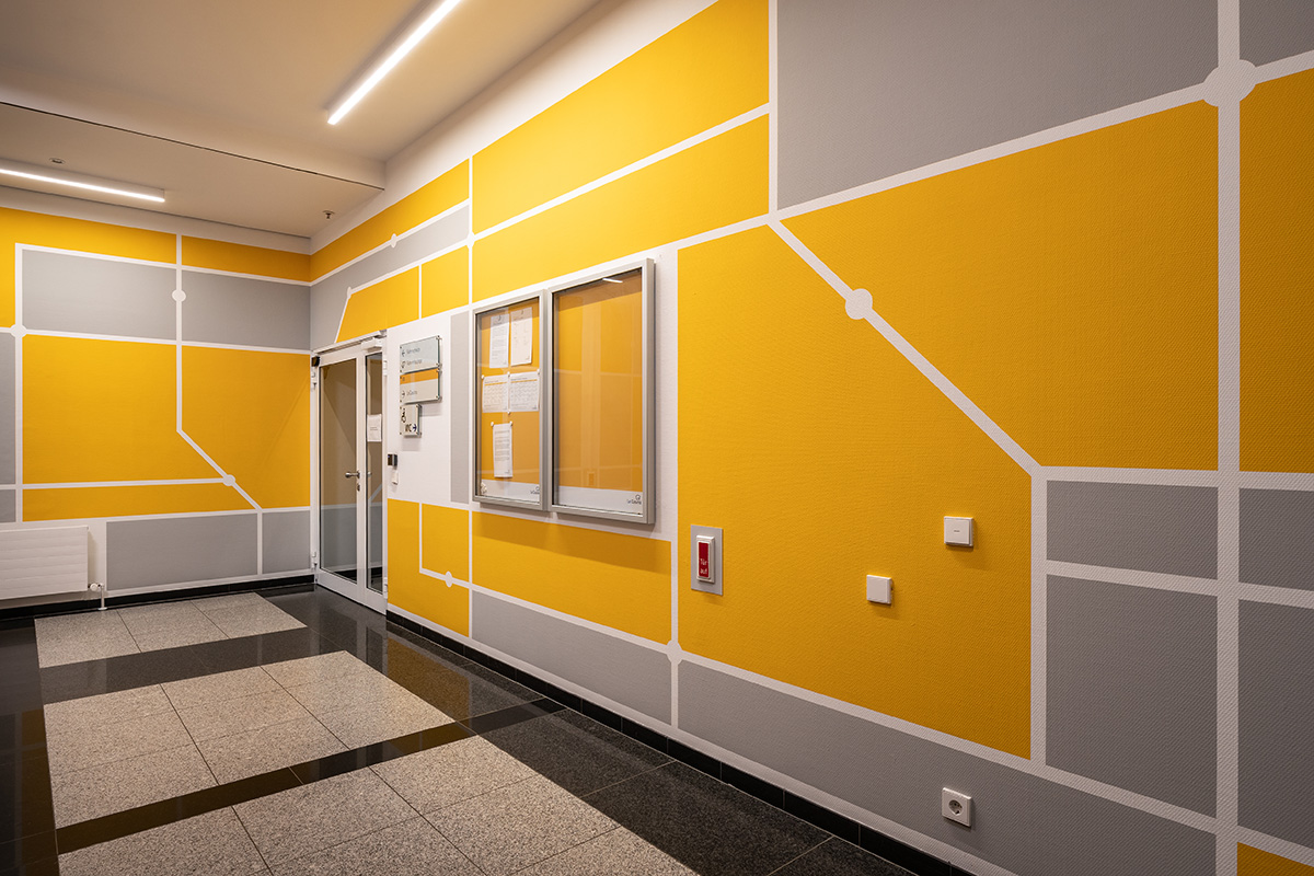 Corporate design for the wall - For the public transport company, the striking design of a network map was abstracted and applied to all walls with public traffic in the company's corporate colors. The artistic murals particularly enliven the dark areas in the building - in combination with matching illuminated panels. "Now the sun is really shining here!" and "Finally, a design that has something to do with us." - that's what users have to say.